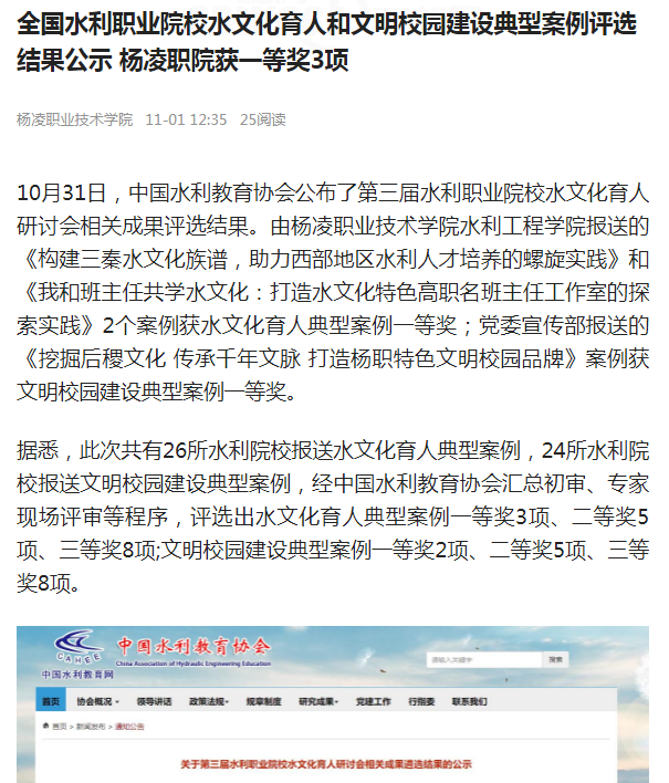 【陕西头条】全国水利职业院校水文化育人和文明校园建设典型案例评选结果公示 杨凌职院获一等奖3项
