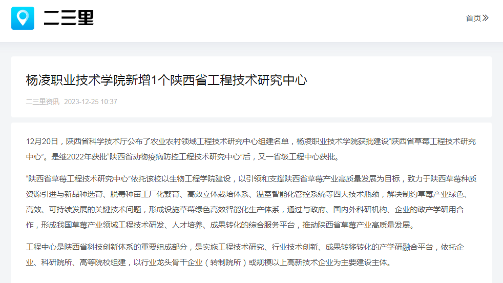 12月20日,陕西省科学技术厅公布了农业农村领域工程技术研究中心组建名单,杨凌职业技术学院获批建设“陕西省草莓工程技术研究中心”。是继2022年获批“陕西省动物疫病防控工程技术研究中心”后,又一省级工程中心获批。