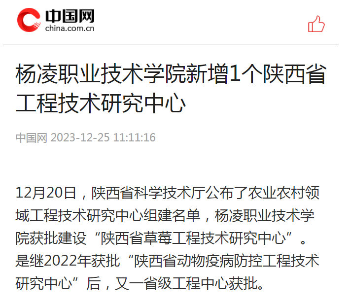 【中国网】杨凌职业技术学院新增1个陕西省工程技术研究中心