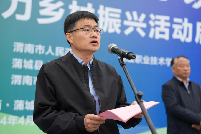 4月10日,由陕西省教育厅、渭南市委市政府和杨凌职业技术学院主办的第32届“科技之春”助力乡村振兴活动启动仪式在渭南市蒲城县中心广场举行。杨凌职业技术学院党委书记王周锁宣布第32届“科技之春”助力乡村振兴活动启动。省教育厅高校技术转移中心主任田鹏,渭南市农业农村局党委委员、副局长刘刚、党组成员、副局长普布顿珠,渭南市农科院院长王杨军,杨凌职业技术学院副校长胡俊鹏,蒲城县副县长冯新等出席启动仪式。