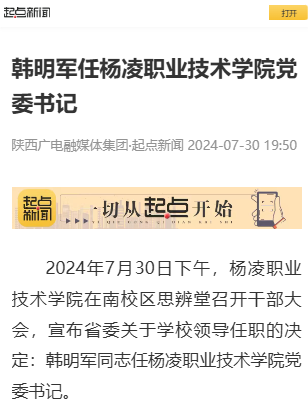 【起点新闻】韩明军任杨凌职业技术学院党委书记