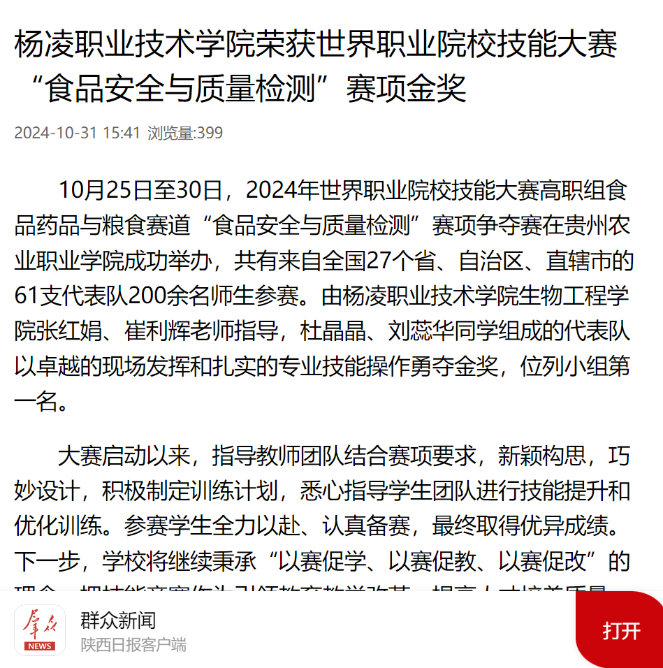 【群众新闻网】杨凌职业技术学院荣获世界职业院校技能大赛“食品安全与质量检测”赛项金奖