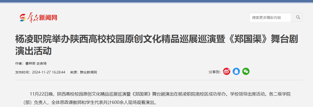 11月22日晚,陕西高校校园原创文化精品巡展巡演暨《郑国渠》舞台剧演出在杨凌职院南校区成功举办。学校领导出席活动。各二级学院(部)负责人,全体思政课教师和学生代表共计600余人现场观看演出。