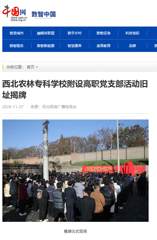 追溯红色足迹,赓续红色血脉。11月27日上午,西北农林专科学校附设高职党支部活动旧址揭牌仪式在杨凌职业技术学院农林综合实训基地举行。陕西省委教育工委副书记王海波,杨凌示范区党工委委员、管委会副主任刘仲山,杨凌职业技术学院党委书记韩明军、校长仲伟周,陕西省委教育工委组织部部长胡海宁,陕西建工集团股份有限公司工程六部党总支书记、副总经理余科峰,杨凌示范区党工委宣传部副部长赵燕,西北农林科技大学党委组织部副部长张成凤等出席揭牌仪式。揭牌仪式由杨凌职业技术学院党委副书记刘瑞明主持。