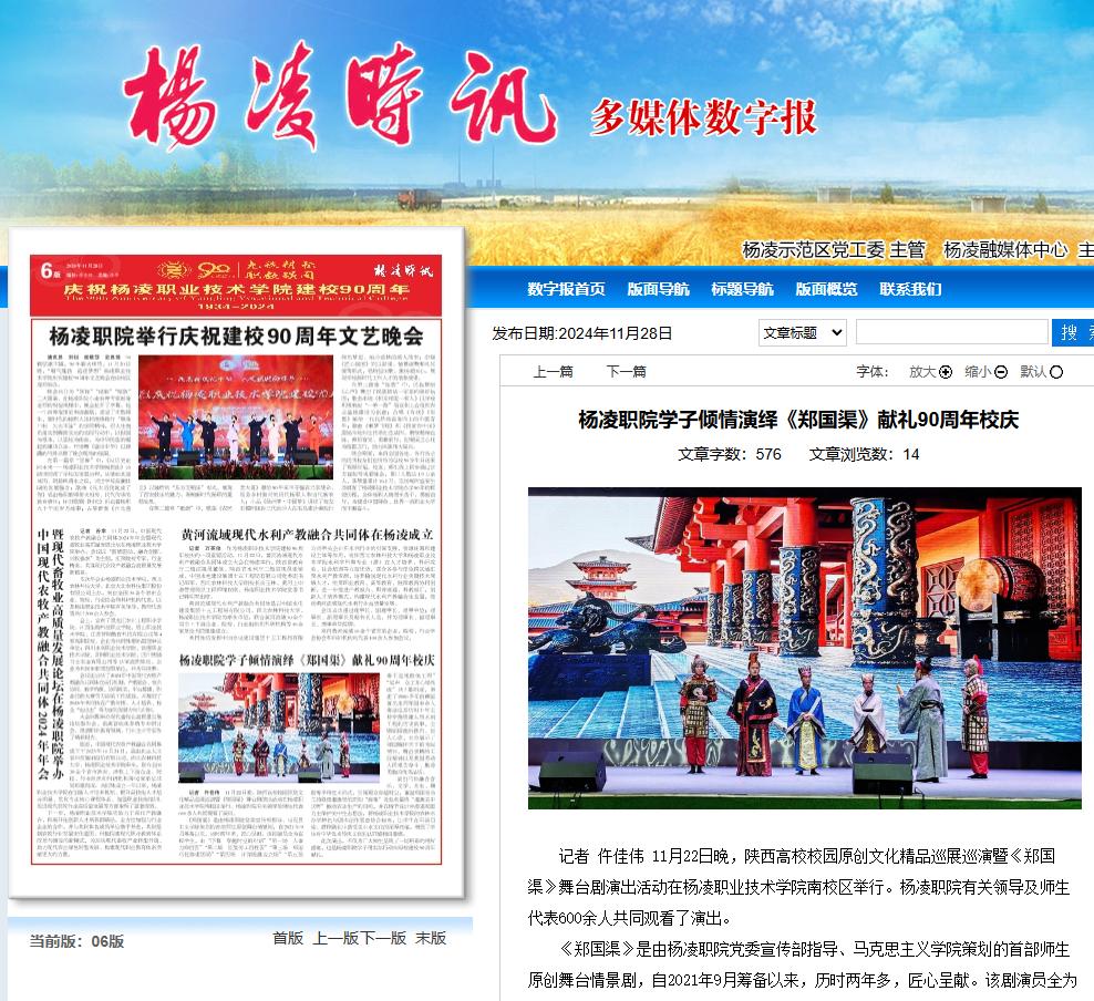 记者 仵佳伟 11月22日晚,陕西高校校园原创文化精品巡展巡演暨《郑国渠》舞台剧演出活动在杨凌职业技术学院南校区举行。杨凌职院有关领导及师生代表600余人共同观看了演出。