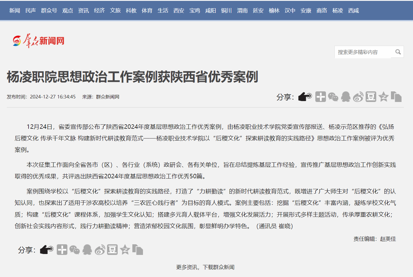 【群众新闻网】杨凌职院思想政治工作案例获陕西省优秀案例