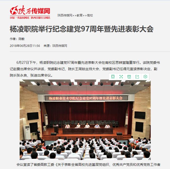 6月27日下午,杨凌职院庆祝建党97周年暨先进表彰大会在南校区思辨堂隆重举行。该院党委书记赵曼出席会议并讲话,党委副书记、院长王周锁主持大会,党委副书记任得元宣读表彰决定,副院长张永良、张迪出席会议。