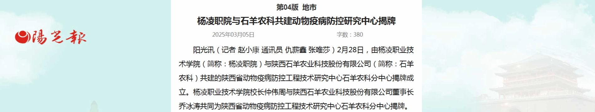 【阳光报】杨凌职院与石羊农科共建动物疫病防控研究中心揭牌