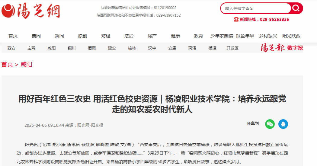 作为一所以农林水为底色的中国特色高水平高职学校,近年来,杨凌职业技术学院聚焦立德树人根本任务,用好中国共产党解决“三农”问题的百年历史,用活红色校史,大力开展红色文化资源的立体挖掘和多元呈现行动,通过深挖资源、讲好红课、建强阵地、创新机制等举措,着力培养学生的“爱国奉献、追求卓越”精神,形成了依托红色文化资源培养知农爱农新型人才的涉农高校特色育人模式。