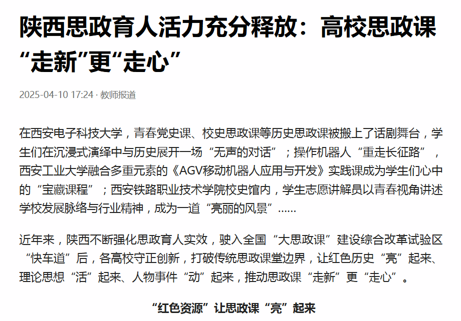 在西安电子科技大学,青春党史课、校史思政课等历史思政课被搬上了话剧舞台,学生们在沉浸式演绎中与历史展开一场“无声的对话”;操作机器人“重走长征路”,西安工业大学融合多重元素的《AGV移动机器人应用与开发》实践课成为学生们心中的“宝藏课程”;西安铁路职业技术学院校史馆内,学生志愿讲解员以青春视角讲述学校发展脉络与行业精神,成为一道“亮丽的风景”……