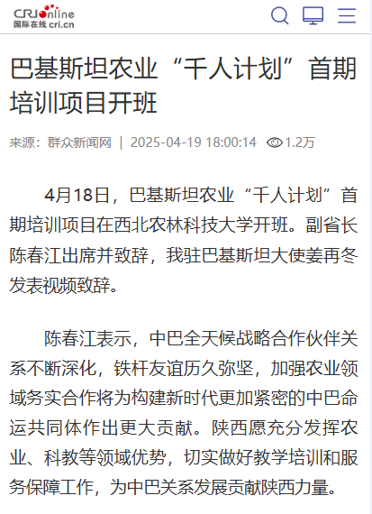 【群众新闻网】巴基斯坦农业“千人计划”首期培训项目开班