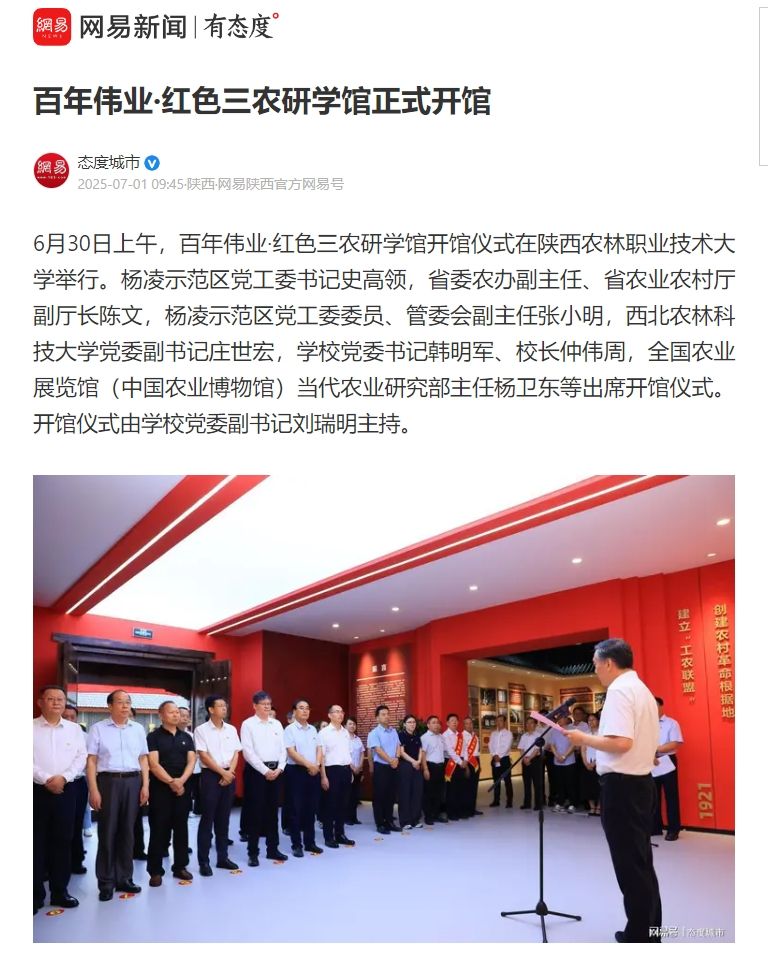 6月30日上午,百年伟业·红色三农研学馆开馆仪式在KY开元集团官网入口举行。杨凌示范区党工委书记史高领,省委农办副主任、省农业农村厅副厅长陈文,杨凌示范区党工委委员、管委会副主任张小明,西北农林科技大学党委副书记庄世宏,学校党委书记韩明军、校长仲伟周,全国农业展览馆(中国农业博物馆)当代农业研究部主任杨卫东等出席开馆仪式。开馆仪式由学校党委副书记刘瑞明主持。