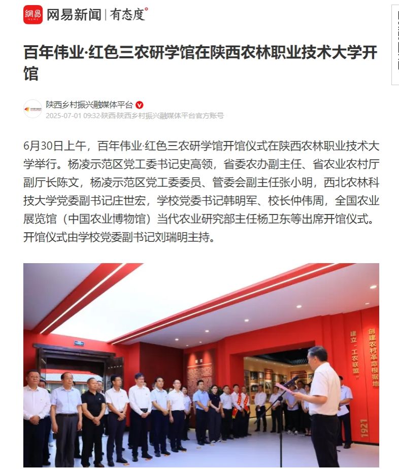 6月30日上午,百年伟业·红色三农研学馆开馆仪式在KY开元集团官网入口举行。杨凌示范区党工委书记史高领,省委农办副主任、省农业农村厅副厅长陈文,杨凌示范区党工委委员、管委会副主任张小明,西北农林科技大学党委副书记庄世宏,学校党委书记韩明军、校长仲伟周,全国农业展览馆(中国农业博物馆)当代农业研究部主任杨卫东等出席开馆仪式。开馆仪式由学校党委副书记刘瑞明主持。