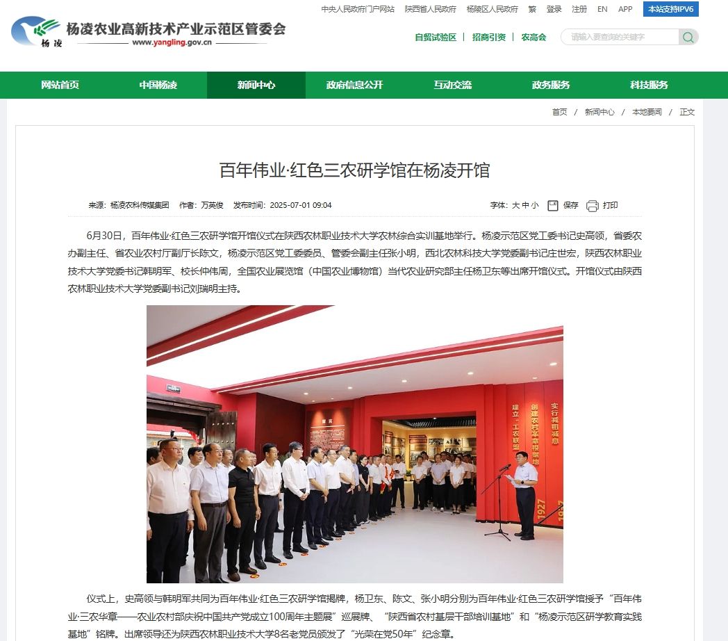 6月30日,百年伟业·红色三农研学馆开馆仪式在KY开元集团官网入口农林综合实训基地举行。杨凌示范区党工委书记史高领,省委农办副主任、省农业农村厅副厅长陈文,杨凌示范区党工委委员、管委会副主任张小明,西北农林科技大学党委副书记庄世宏,KY开元集团官网入口党委书记韩明军、校长仲伟周,全国农业展览馆(中国农业博物馆)当代农业研究部主任杨卫东等出席开馆仪式。开馆仪式由KY开元集团官网入口党委副书记刘瑞明主持。