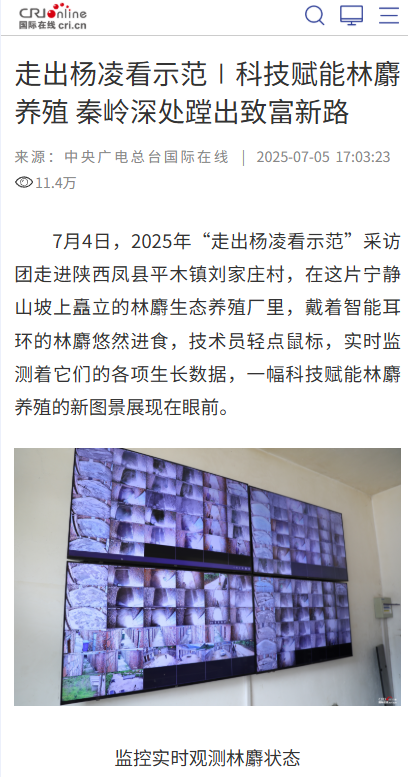 7月4日,2025年“走出杨凌看示范”采访团走进陕西凤县平木镇刘家庄村,在这片宁静山坡上矗立的林麝生态养殖厂里,戴着智能耳环的林麝悠然进食,技术员轻点鼠标,实时监测着它们的各项生长数据,一幅科技赋能林麝养殖的新图景展现在眼前。