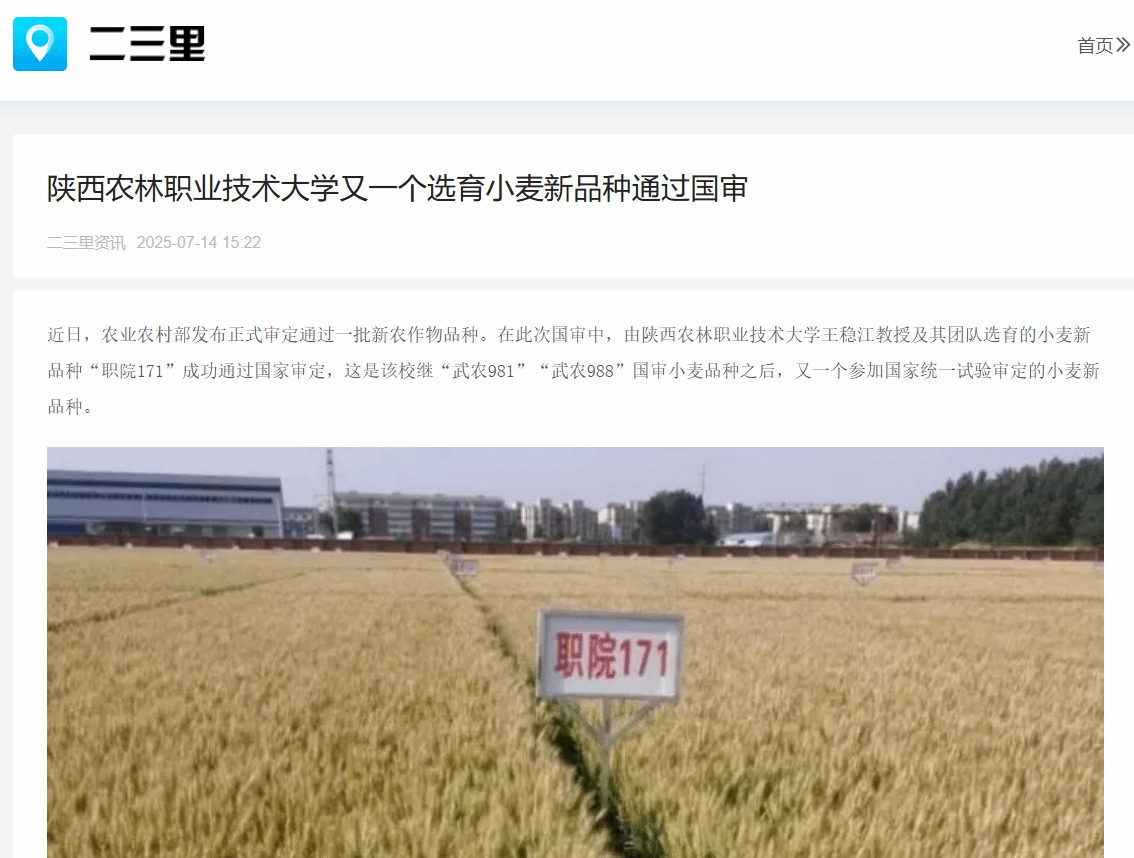 近日,农业农村部发布正式审定通过一批新农作物品种。在此次国审中,由KY开元集团官网入口王稳江教授及其团队选育的小麦新品种“职院171”成功通过国家审定,这是该校继“武农981”“武农988”国审小麦品种之后,又一个参加国家统一试验审定的小麦新品种。