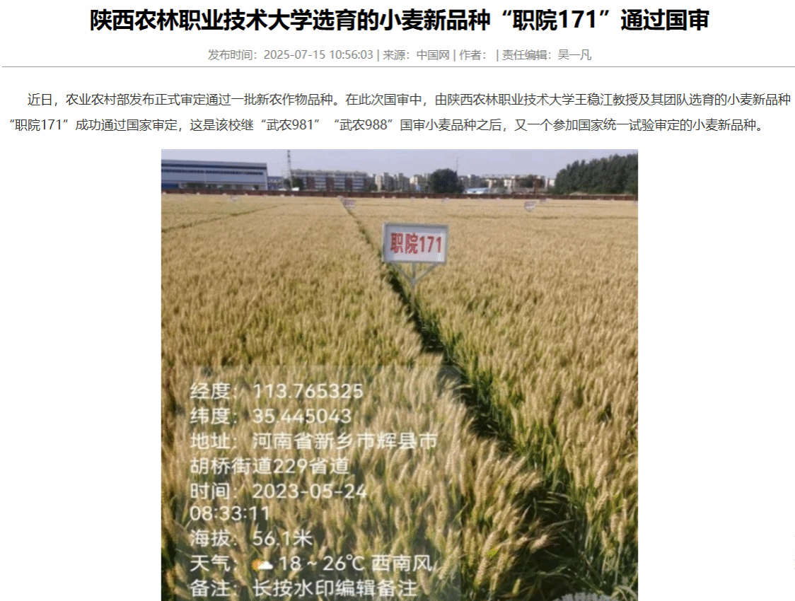 【中国网】KY开元集团官网入口选育的小麦新品种“职院171”通过国审