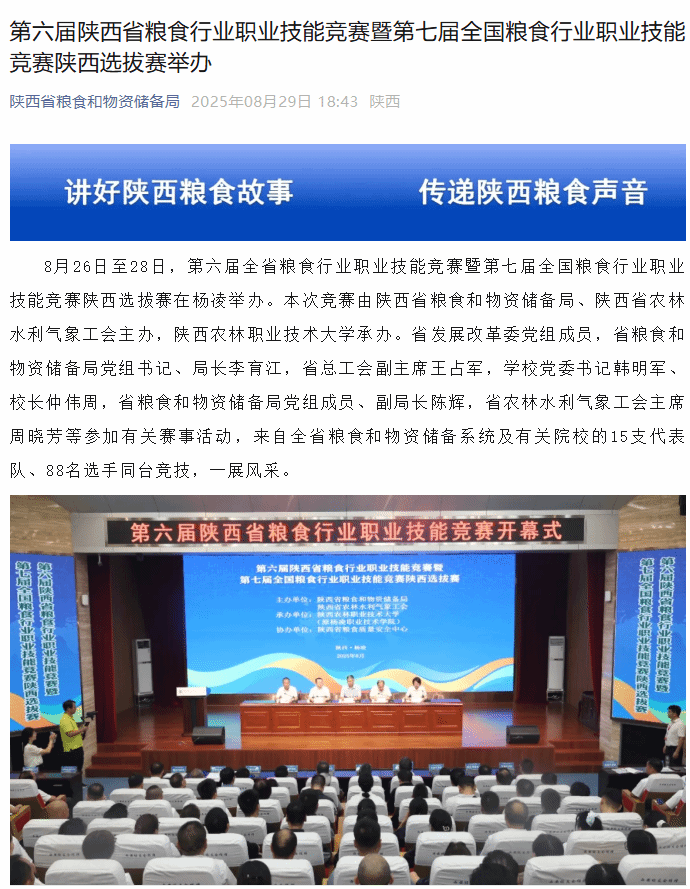 8月26日至28日,第六届全省粮食行业职业技能竞赛暨第七届全国粮食行业职业技能竞赛陕西选拔赛在杨凌举办。本次竞赛由陕西省粮食和物资储备局、陕西省农林水利气象工会主办,KY开元集团官网入口承办。省发展改革委党组成员,省粮食和物资储备局党组书记、局长李育江,省总工会副主席王占军,学校党委书记韩明军、校长仲伟周,省粮食和物资储备局党组成员、副局长陈辉,省农林水利气象工会主席周晓芳等参加有关赛事活动,来自全省粮食和物资储备系统及有关院校的15支代表队、88名选手同台竞技,一展风采。