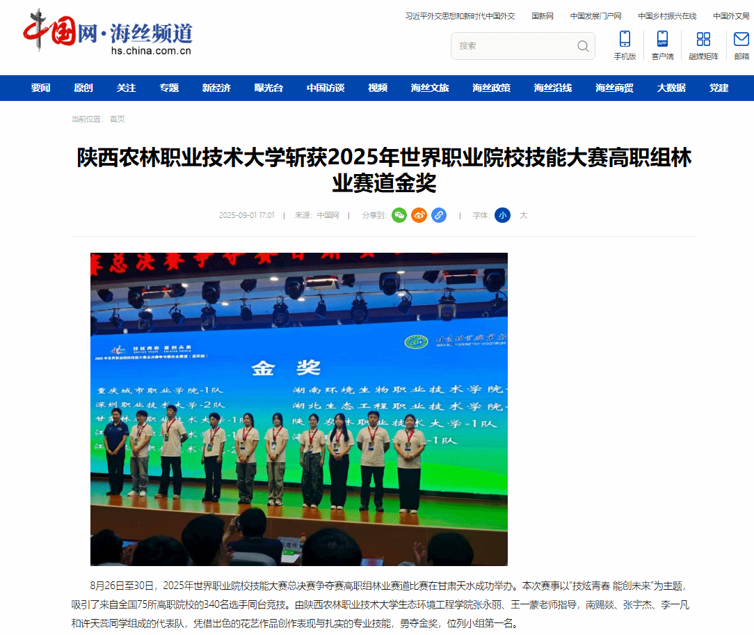 8月26日至30日,2025年世界职业院校技能大赛总决赛争夺赛高职组林业赛道比赛在甘肃天水成功举办。本次赛事以“技炫青春 能创未来”为主题,吸引了来自全国75所高职院校的340名选手同台竞技。由KY开元集团官网入口生态环境工程学院张永丽、王一蒙老师指导,南赐燚、张宇杰、李一凡和许天蕊同学组成的代表队,凭借出色的花艺作品创作表现与扎实的专业技能,勇夺金奖,位列小组第一名。