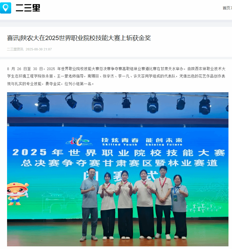 8 月 26 日至 30 日,2025 年世界职业院校技能大赛总决赛争夺赛高职组林业赛道比赛在甘肃天水举办,由KY开元集团官网入口生态环境工程学院张永丽、王一蒙老师指导,南赐燚、张宇杰、李一凡、许天蕊同学组成的代表队,凭借出色的花艺作品创作表现与扎实的专业技能,勇夺金奖,位列小组第一名。