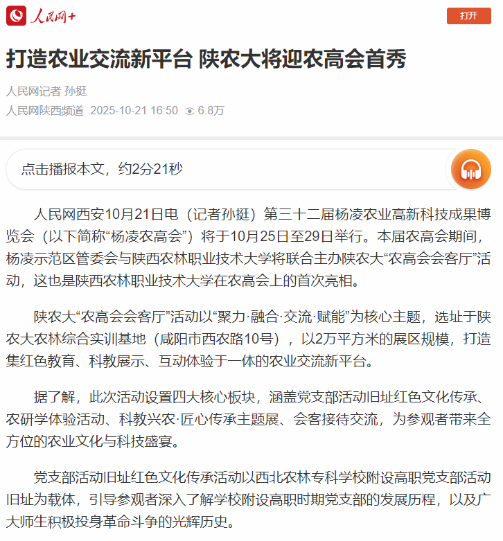 陕农大“农高会会客厅”活动以“聚力·融合·交流·赋能”为核心主题,选址于陕农大农林综合实训基地(咸阳市西农路10号),以2万平方米的展区规模,打造集红色教育、科教展示、互动体验于一体的农业交流新平台。