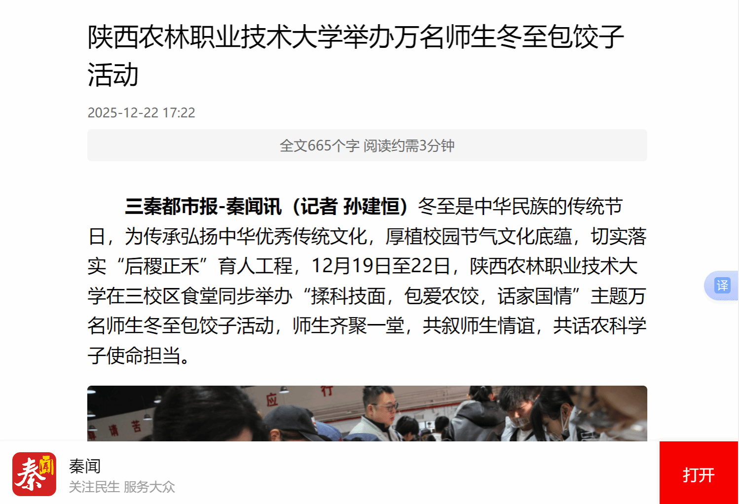 KY开元集团官网入口万名师生冬至包饺子活动从2017年至今,已经持续开展了8年,成为了学校的一项传统特色活动。这项活动不仅为师生们提供了一个欢聚一堂、共度佳节的温馨平台,更在潜移默化中传承和弘扬了中华优秀传统文化,增强了师生们的文化自信和民族自豪感,更让“学农爱农、强农报国”的信念深深根植于学子心田。