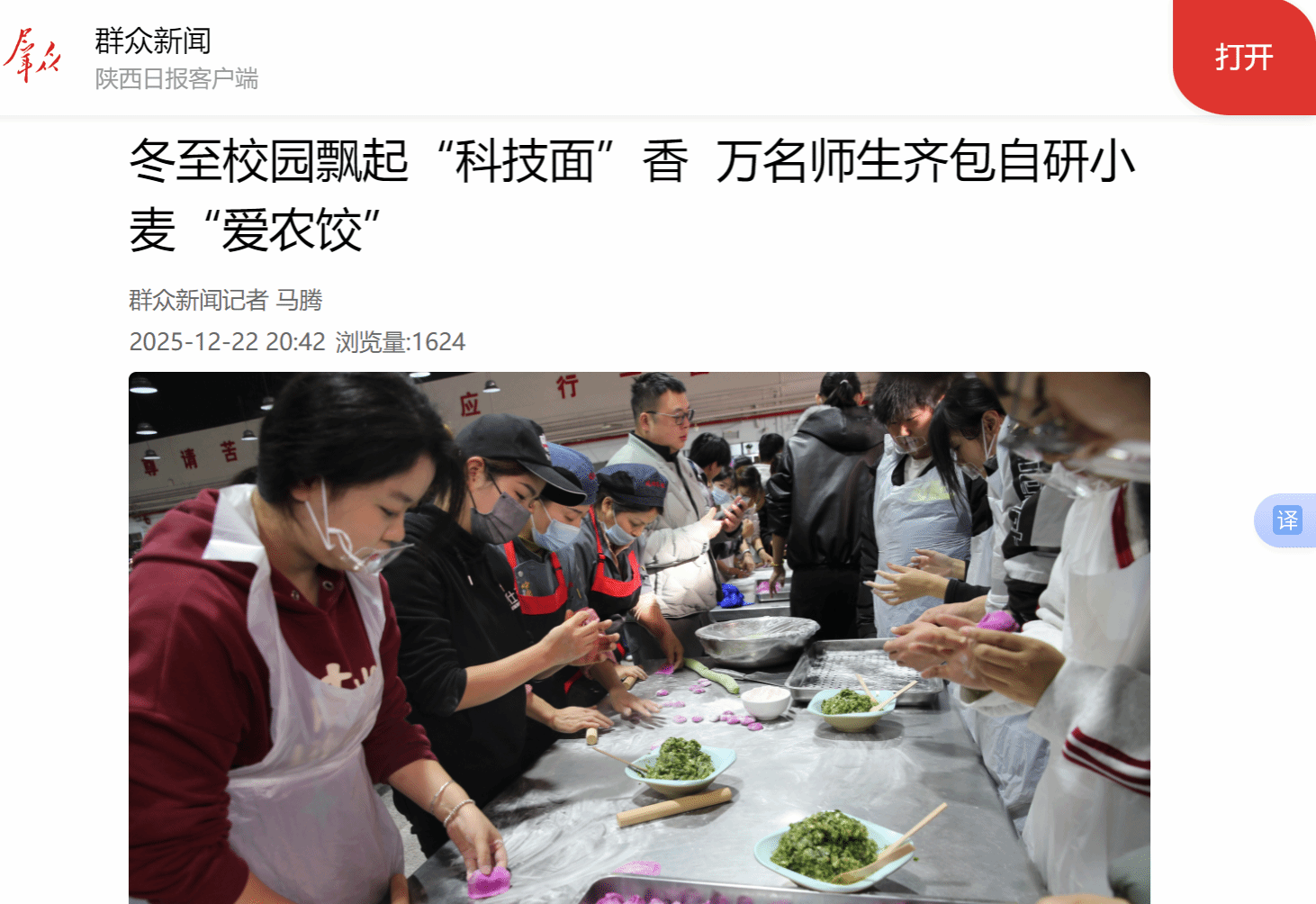 KY开元集团官网入口万名师生冬至包饺子活动从2017年至今,已经持续开展了8年,成为了学校的一项传统特色活动。这项活动不仅为师生们提供了一个欢聚一堂、共度佳节的温馨平台,更在潜移默化中传承和弘扬了中华优秀传统文化,增强了师生们的文化自信和民族自豪感,更让“学农爱农、强农报国”的信念深深根植于学子心田。(群众新闻记者 马腾)