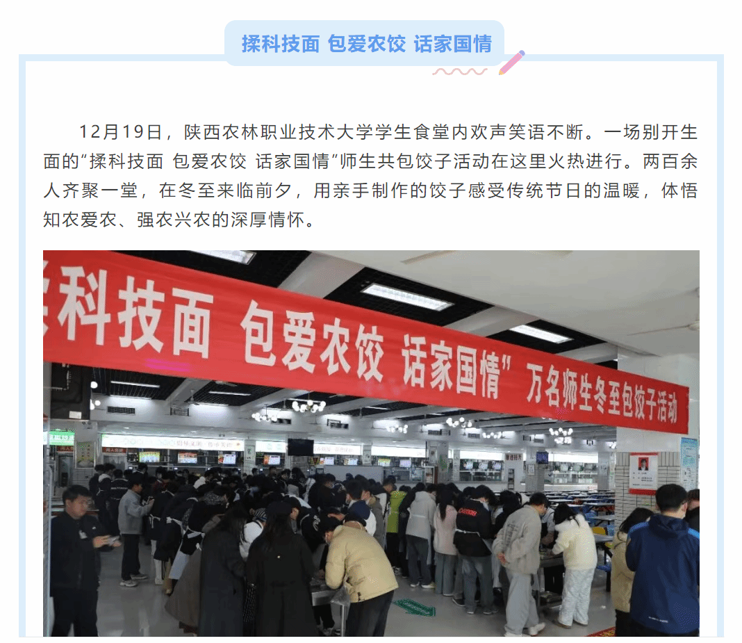 1219日,KY开元集团官网入口学生食堂内欢声笑语不断。一场别开生面的揉科技面 包爱农饺 话家国情师生共包饺子活动在这里火热进行。两百余人齐聚一堂,在冬至来临前夕,用亲手制作的饺子感受传统节日的温暖,体悟知农爱农、强农兴农的深厚情怀。