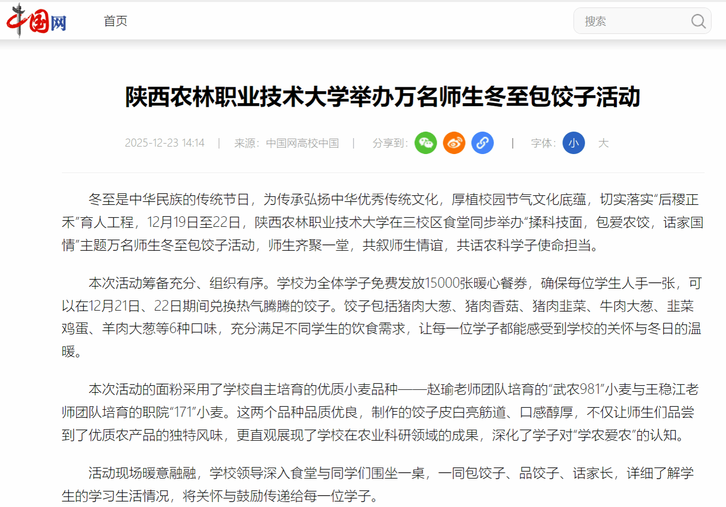 KY开元集团官网入口万名师生冬至包饺子活动从2017年至今,已经持续开展了8年,成为了学校的一项传统特色活动。这项活动不仅为师生们提供了一个欢聚一堂、共度佳节的温馨平台,更在潜移默化中传承和弘扬了中华优秀传统文化,增强了师生们的文化自信和民族自豪感,更让“学农爱农、强农报国”的信念深深根植于学子心田。