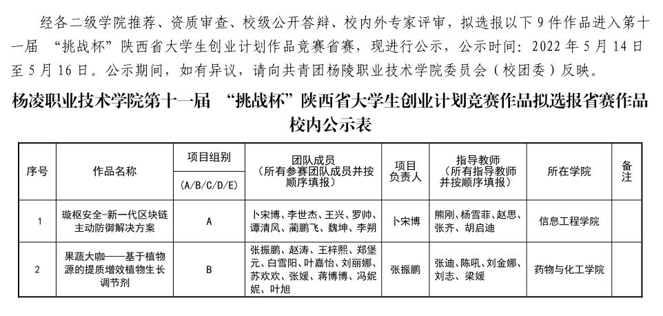 关于选报第十一届 “挑战杯”陕西省大学生创业计划作品竞赛省级作品的公示