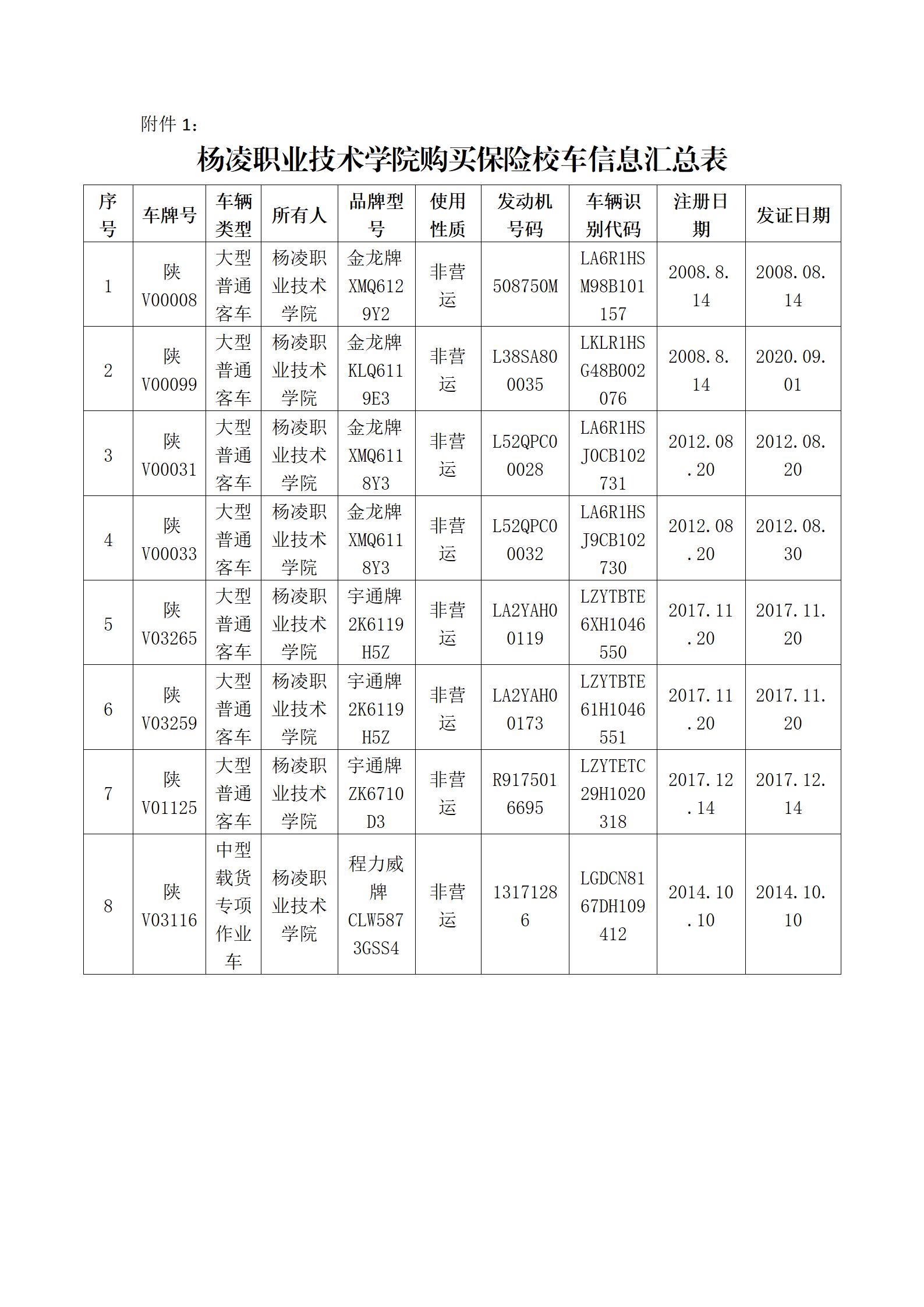 附:1.杨凌职业技术学院购买保险校车信息汇总表;