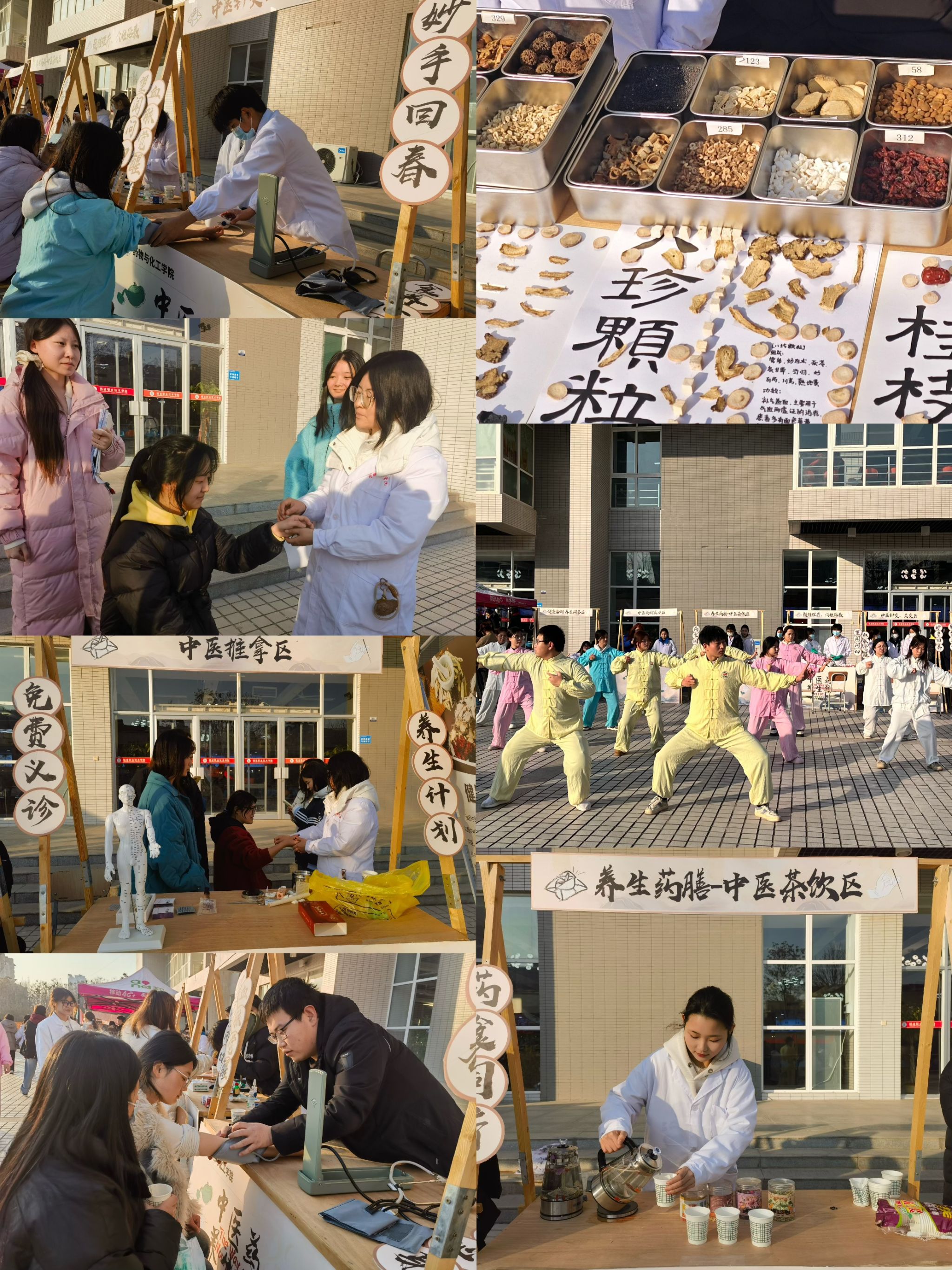 在健康养生区,药物与化工学院现场开展的八段锦教学展示、血压和血糖测量、中医药材展示、中医推拿、针灸及健康养生知识宣传等吸引了众多学生驻足体验,在学生群体中普及实用的健康知识,提高了学生的自我保健意识。